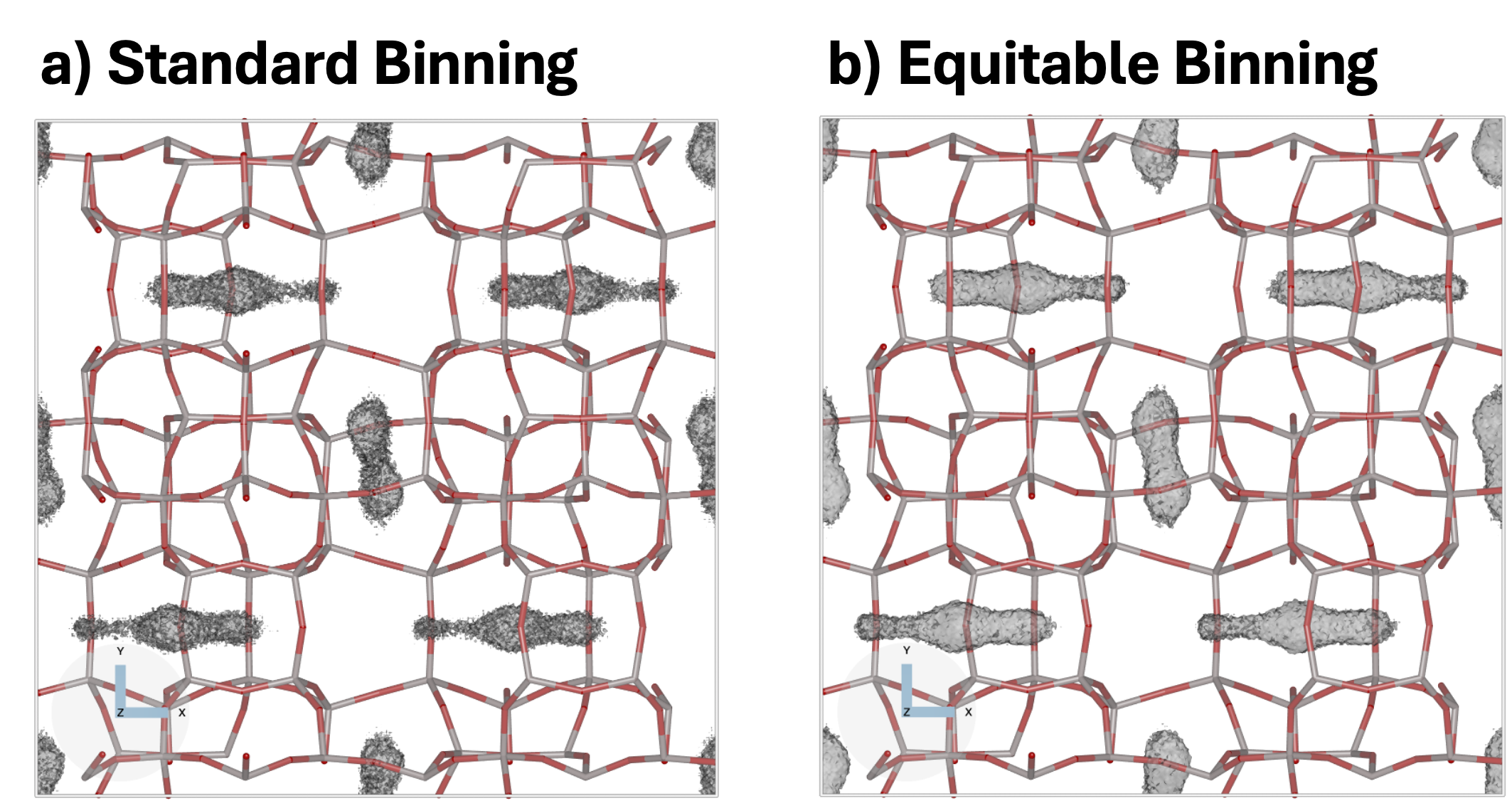 With equitable binning, each guest site contributes fractionally to neighbouring voxels based on its position, reducing discretization artefacts and producing smoother probability distributions. Neither standard nor equitable binning is inherently superior, and for well converged simulations the resulting local maxima are expected to be very similar. The figure below compares the two binning schemes at a representative isovalue, highlighting the primarily visual nature of the differences.